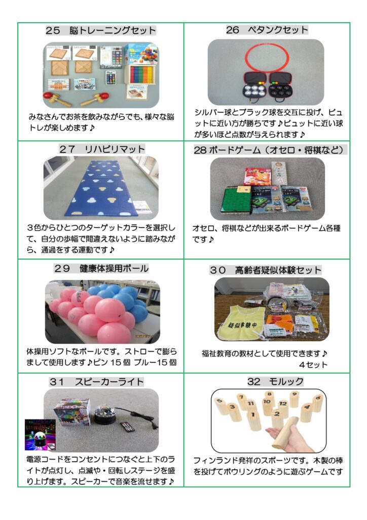 | 対象者 | いきいきふれあいサロン、老人クラブ、地域行事で使用される団体 (個人の方への貸出しはしていません) |