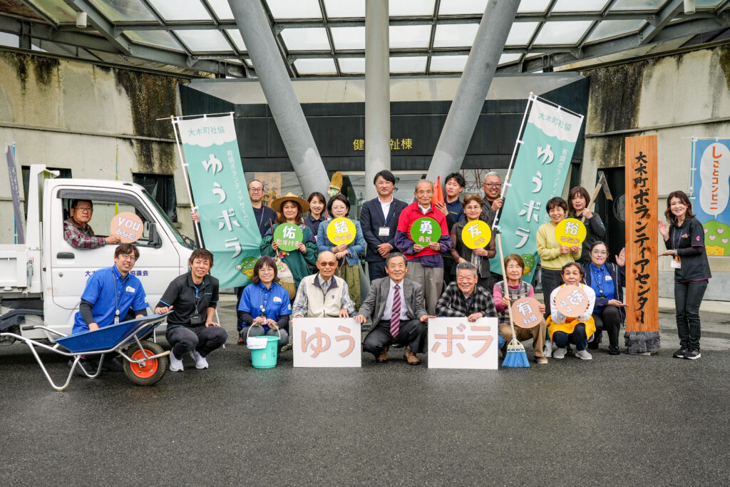 (👆ボランティアの方々と広川町社協の江口次長との写真)